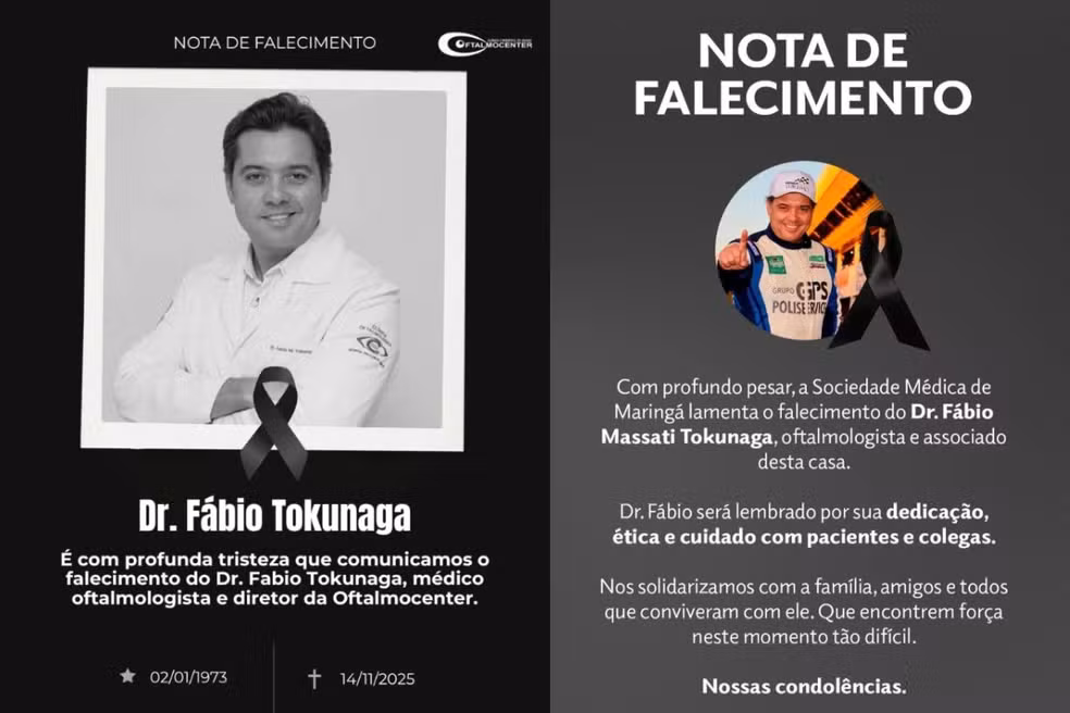 “É com profunda tristeza que comunicamos o falecimento do Dr. Fabio Tokunaga, médico oftalmologista e diretor da Oftalmocenter. Dr. Fabio foi mais que um profissional exemplar: foi um ser humano íntegro, generoso e dedicado ao cuidado com as pessoas. Sua ausência deixa um vazio imenso entre familiares, colegas, colaboradores, pacientes e todos que tiveram o privilégio de conviver com ele. Neste momento de dor, expressamos nossa solidariedade à família, amigos e a todos que o amavam. Que possamos preservar sua memória com carinho e gratidão por tudo o que ele representou”, informou a nota.